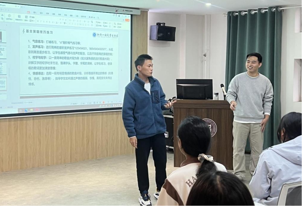 张老师以“声音的艺术”为切入点,介绍了美声、民族、流行及原生态等不同声乐类型的演唱风格,结合经典片段赏析,生动阐释了声乐艺术的多样魅力,激发了同学们的浓厚兴趣。互动环节中,张老师讲解了人体发声器官与腔体构造,示范了科学的呼吸与发声方法,并指导同学们开展气息与发声训练。他强调,正确呼吸是歌唱的基石,掌握气息才能驾驭歌声。